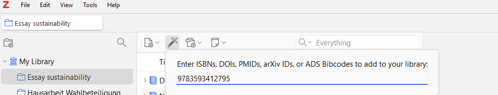 Zotero can also be used to search for identifiers such as ISBN (International Standard Book Number) and DOI (Digital Object Identifier). To do this, use the item “Add entry by identifier” in the Zotero menu bar.